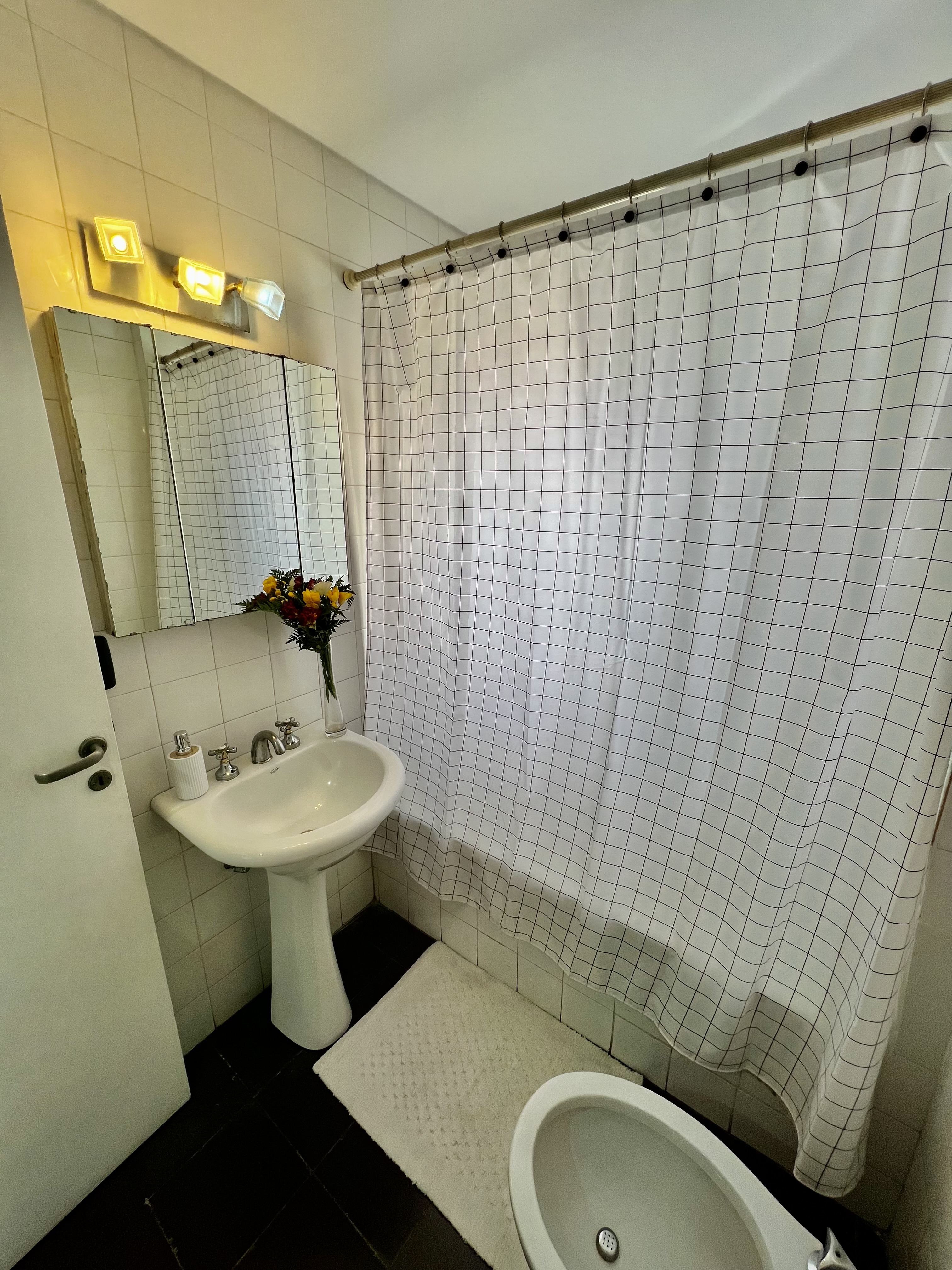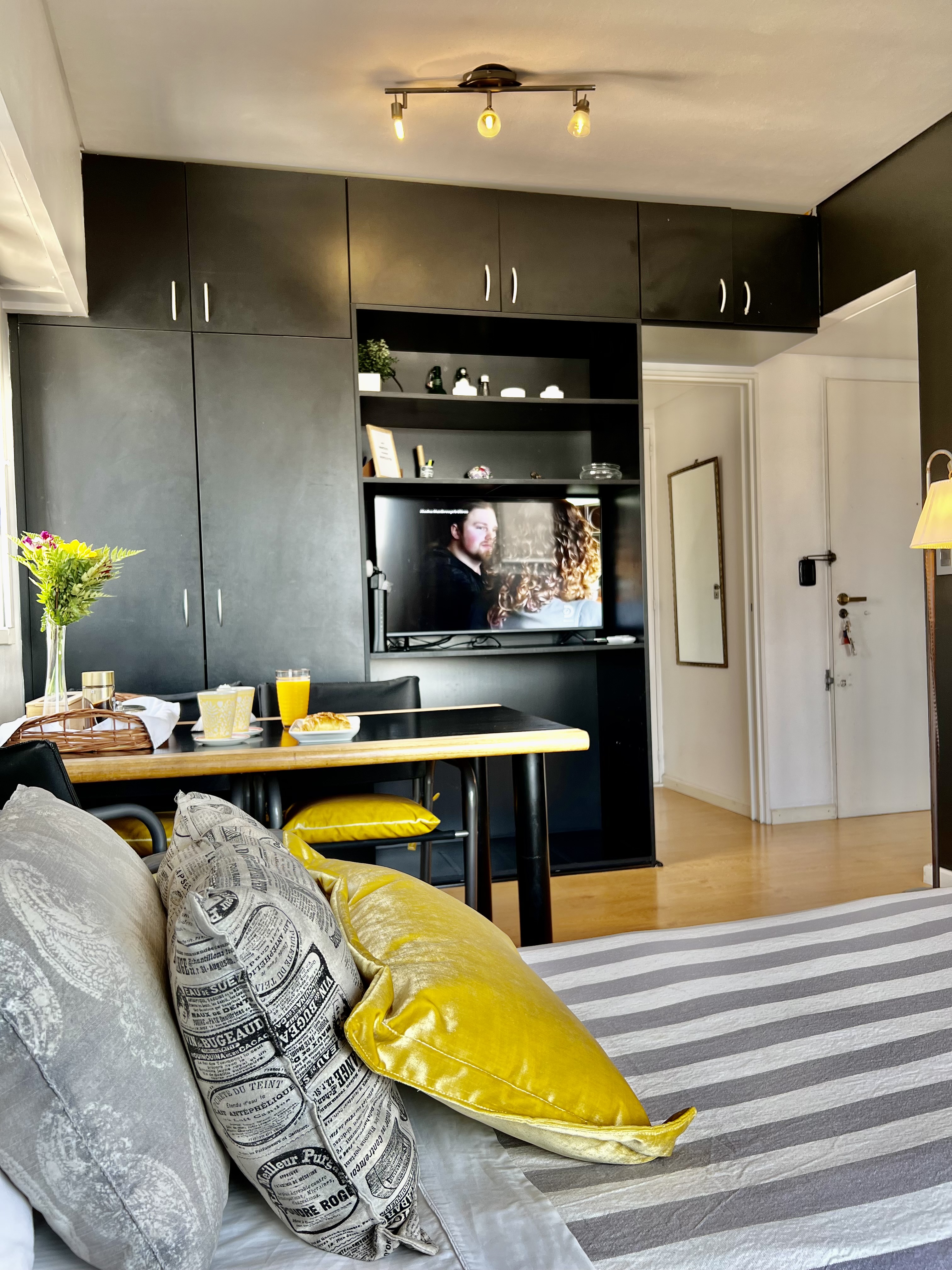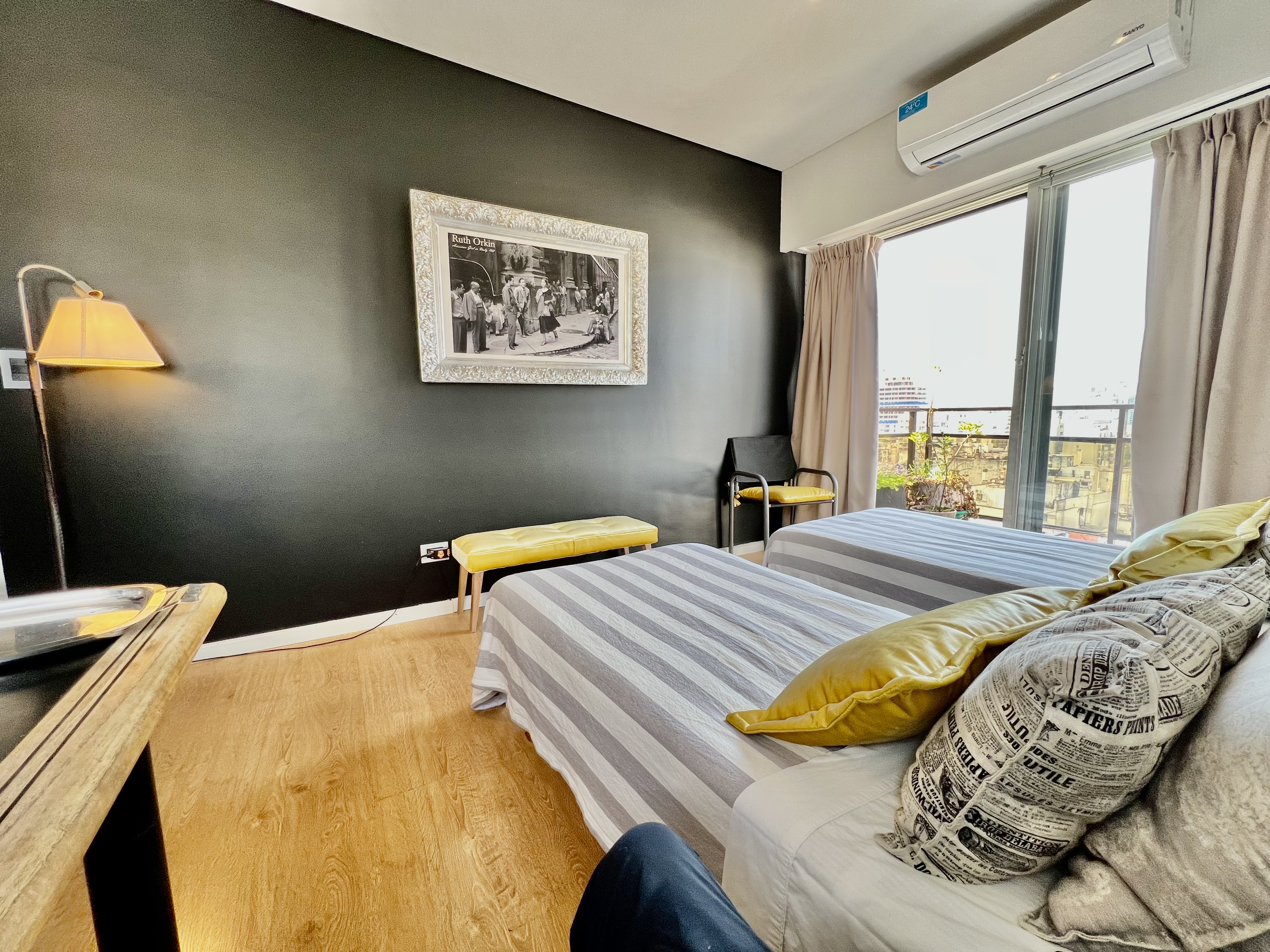 Excelente estudio con una expectacular vista abierta sobre la ciudad con un área de dormitorio separada. Este estudio ofrece un gran espacio para aquellos que están en la ciudad ya sea por vacaciones o por negocios. Aunque simple y minimalista, el apartamento ofrece todo lo esencial para una excelente estadía en la ciudad. A solo tres cuadras del subte y cuatro del Shopping Alto Palermo.El dormitorio da a un ventanal con balcón. Cocina muy bien equipada y lavadero con lavarropas. Amplio baño con bañera. En nuestros alojamientos esta incluida toda la ropa de blanco: sabanas, toallas y repasadores, disponen ademas de desayuno seco: cafe, te, azucar y edulcorantes.
